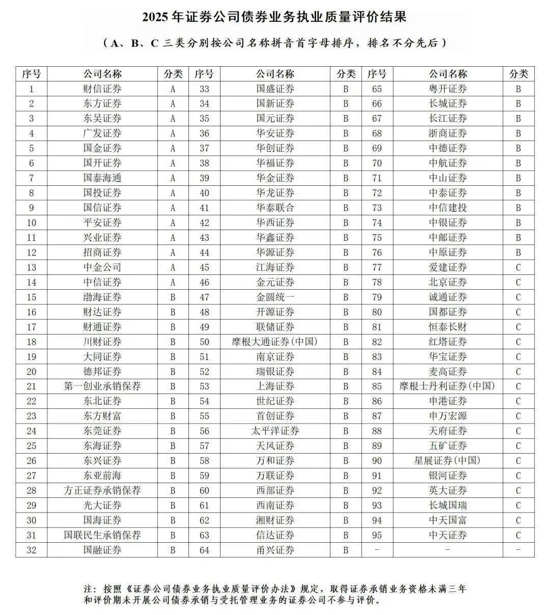 具体来看,中国证券业协会公布的2025年度评价结果显示,在参与评价的93家证券公司中,获得A类评价的有12家,B类66家,C类15家。