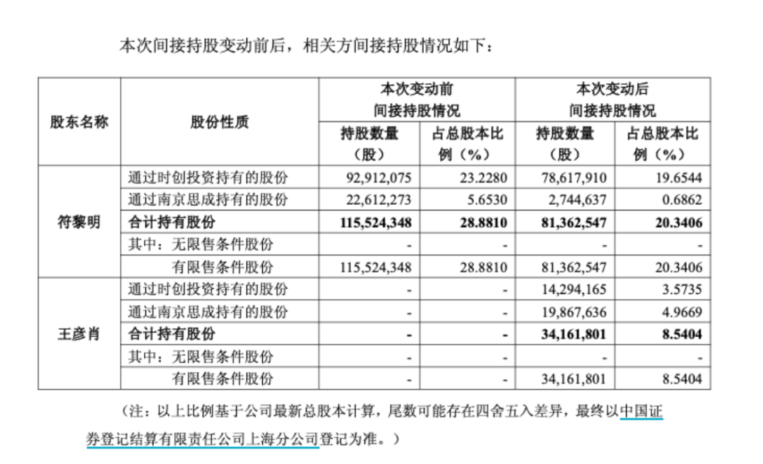 根据双方签署的《离婚协议书》,符黎明拟将其持有的南京时创创业投资有限公司(以下简称时创投资)10.00%的股权及南京思成创业投资合伙企业(有限合伙)(以下简称南京思成)14.48%的财产份额,合计约34161801股公司股份,约占公司总股本的8.54%,分割至王彦肖名下。